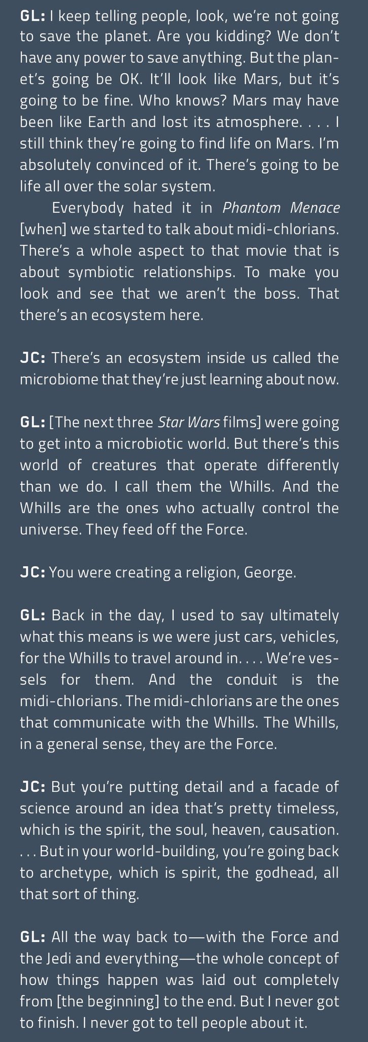 "Vroeger zei ik, wat dit betekent, is dat we uiteindelijk vehikels zijn voor de Whills om in te reizen, meer niet. En de midichlorians zijn de manier waarop ze met ons communiceren. De midichlorians communiceren ook met de Whills, op een algemene manier, zijn zij de Force," aldus Lucas in een verdere toelichting.